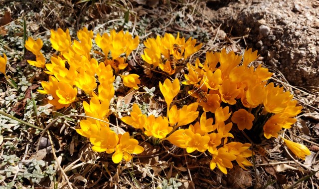 Things are happening here. Can you see all the bees on Crocus ancyrensis ‘Golden Bunch’?