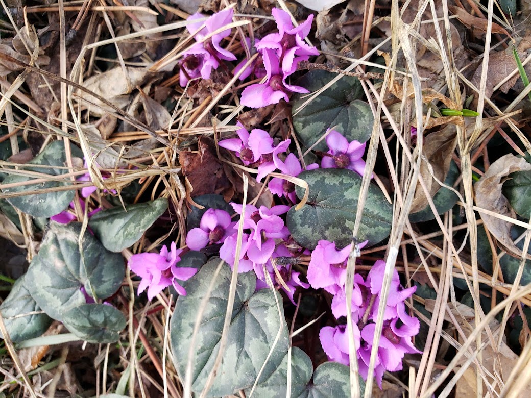 Cyclamen coum is flowering. In some years there would be flowers forming in December, but not after the winter we just had.