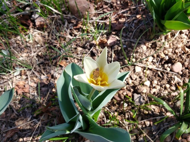 There are “regular” tulips here, too, and though they’re perennial, they do tend to disappear in what the guy I live with says are “annoying ways”, like he would plant a few dozen, and only ten of them would come back year after year. He says it’s because they’re “bred plants”, of which there are very few in the garden. But the species tulips, like the one pictured above, always come back.