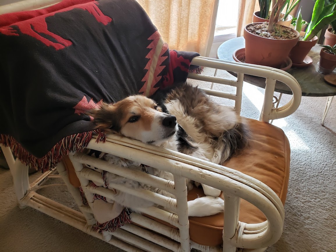 I’ll leave you with a picture of me, taken in the morning, while I was still in the ancient, creaky chair I like to sleep in. After we’re done watching “Q.I.” at night, and the guy I live with switches the program to one that helps him sleep, I like to go down and sleep in the chair that, so I’ve heard, all the other purebred border collies who’ve lived here have slept in, too.
