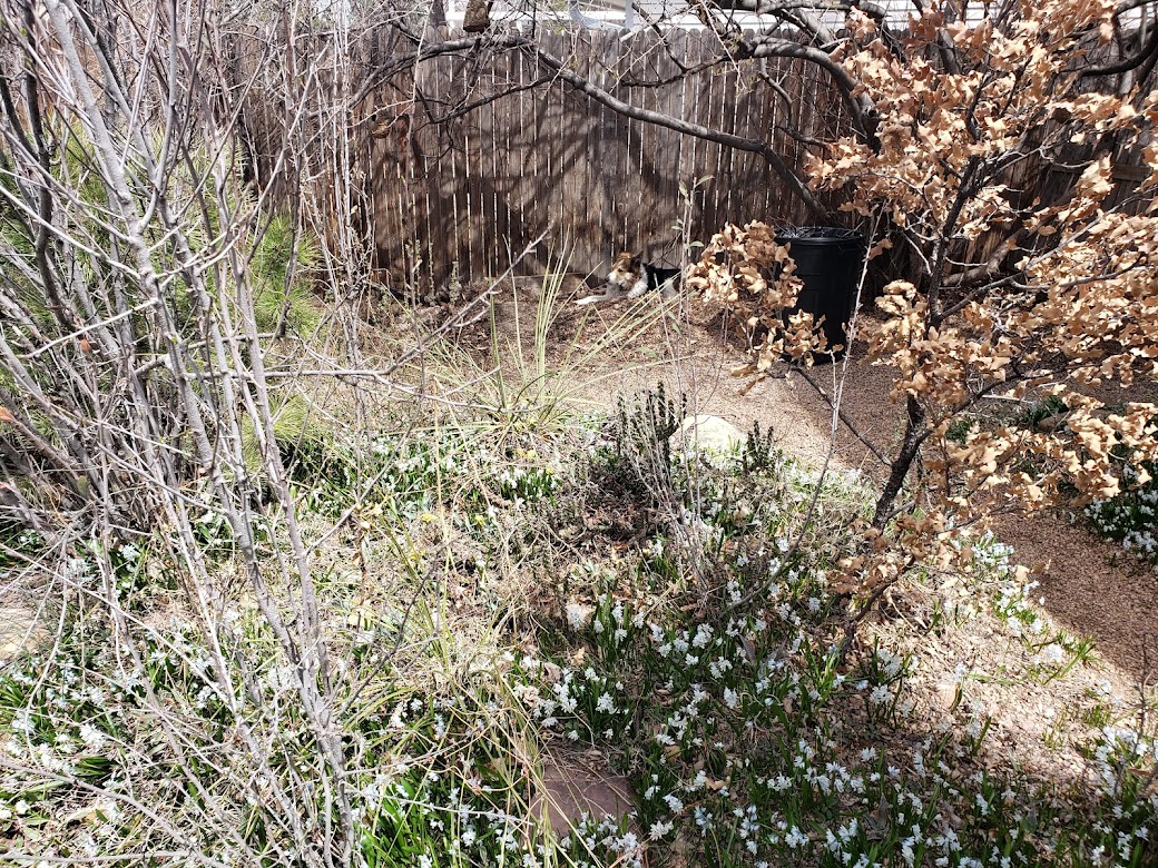 If you’re wondering what all that stuff is, besides the puschkinias, from left to right there’s a dwarf ponderosa pine; Cercocarpus montanus in front; the yucca-looking thing is Nolina greenei; the cactus is Cylindropuntia whipplei; the oak, with its brown leaves, is Quercus undulata. The big branchy thing I’m lying under is Cotoneaster multiflorus. It smells awful when it flowers.