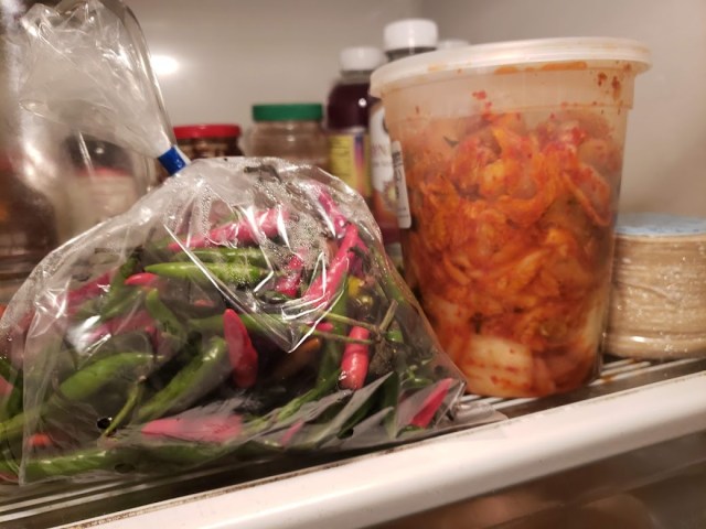 Thai chilies, which he can’t live without, and kimchi. (Oh, and you can see dumpling wrappers; he makes jao tze every now and then, and wontons, too.) There was already a jar of kimchi in the refrigerator, and so I wondered, but he said this was even better, though not quite as good as the kimchi he can get at H Mart, but that’s a long way away.