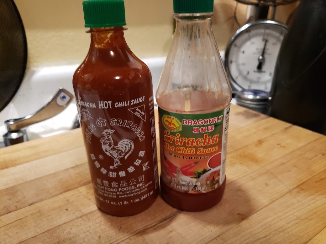 The bottle on the left. I hear that if you really know your sriracha sauce, you call the sauce on the left “rooster sauce”, for obvious reasons, because it isn’t quite like the real thing from Thailand (bottle on the right).