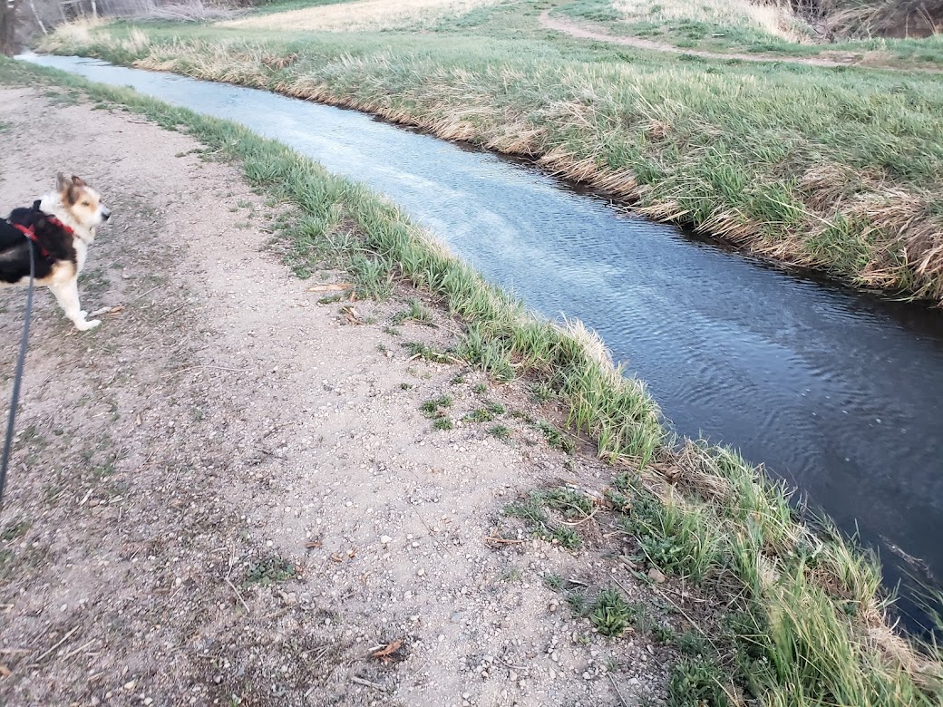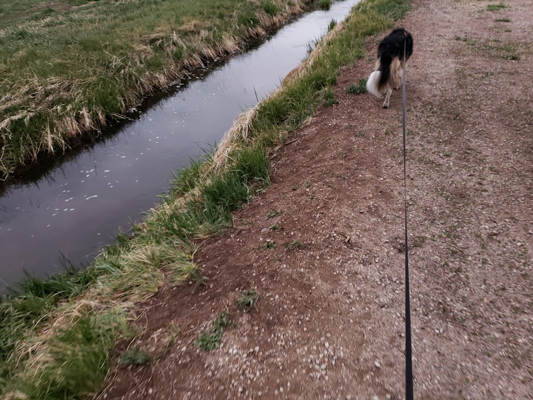 Just this evening, when we were walking along the canal, I leaped toward the edge of the canal bank, to try to get a vole, and then jumped in the water, to see if I could see the vole. The guy I live with said not to do that, and now I see why. The water was really cold. It comes from Mount Evans, which is a pretty high mountain (14,271 feet, or 4,350 meters), and not all that far away from us.