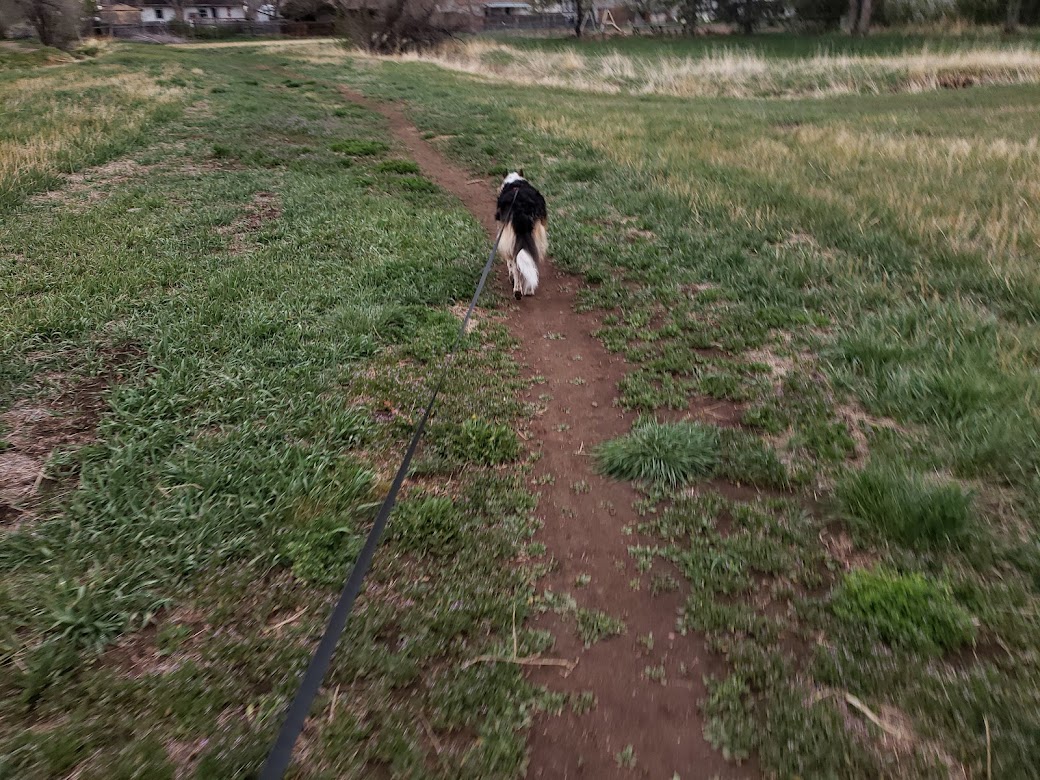 Lots of people and dogs walk on this path. That line of dried grasses is the creek. I sometimes like to hunt for voles along the creek, even though the guy I live with says not to.