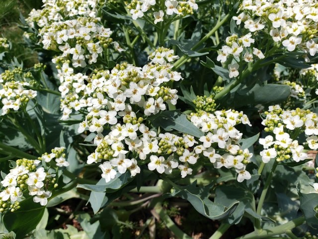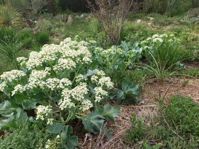 I know, from the constant talking that goes on around here (it’s like background noise, or Muzak), that the guy I live with really isn’t interested in growing a lot of plants that other gardeners grow (except for super-rare bulbs, which are an entirely different story), but for some reason he bought a plant of the sea kale, Crambe maritima, and planted it right in the middle of what used to be called “the great lawn” here, and it’s doing very well.