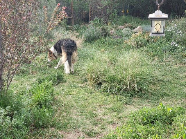 I’m checking on the progress of the buffalo grass, as you can see. It needs more rain. The grasses behind me are Sporobolus airoides. Yes, right in the middle of the lawn. That’s what we call “advanced horticulture” around here.