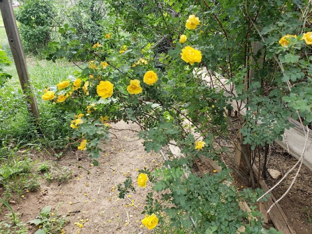 The guy I live with posted some different pictures of this rose on Facebook, and a couple of people said something about “blackspot”. Even with mushrooms growing in the garden, and the extra humidity, it’s too dry for things like “blackspot”.