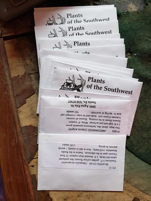 Some seeds arrived in the mail, from Plants of the Southwest. The guy I live with looked at the website, read that mail-order seed sales were stopping this October, and so ordered a bunch.