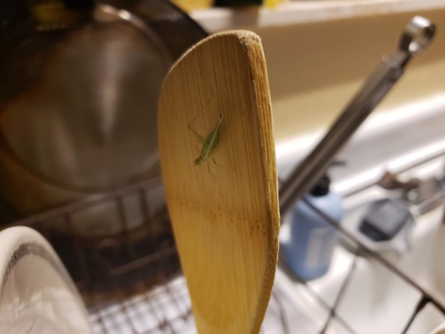 We’re getting little katydids, and sometimes bigger ones, coming into the kitchen. They do get rescued and put back outside, where they’re happier.