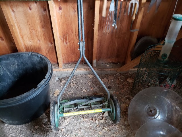 The push type lawnmowers are fine for little lawns like mine. (It’s my lawn.)