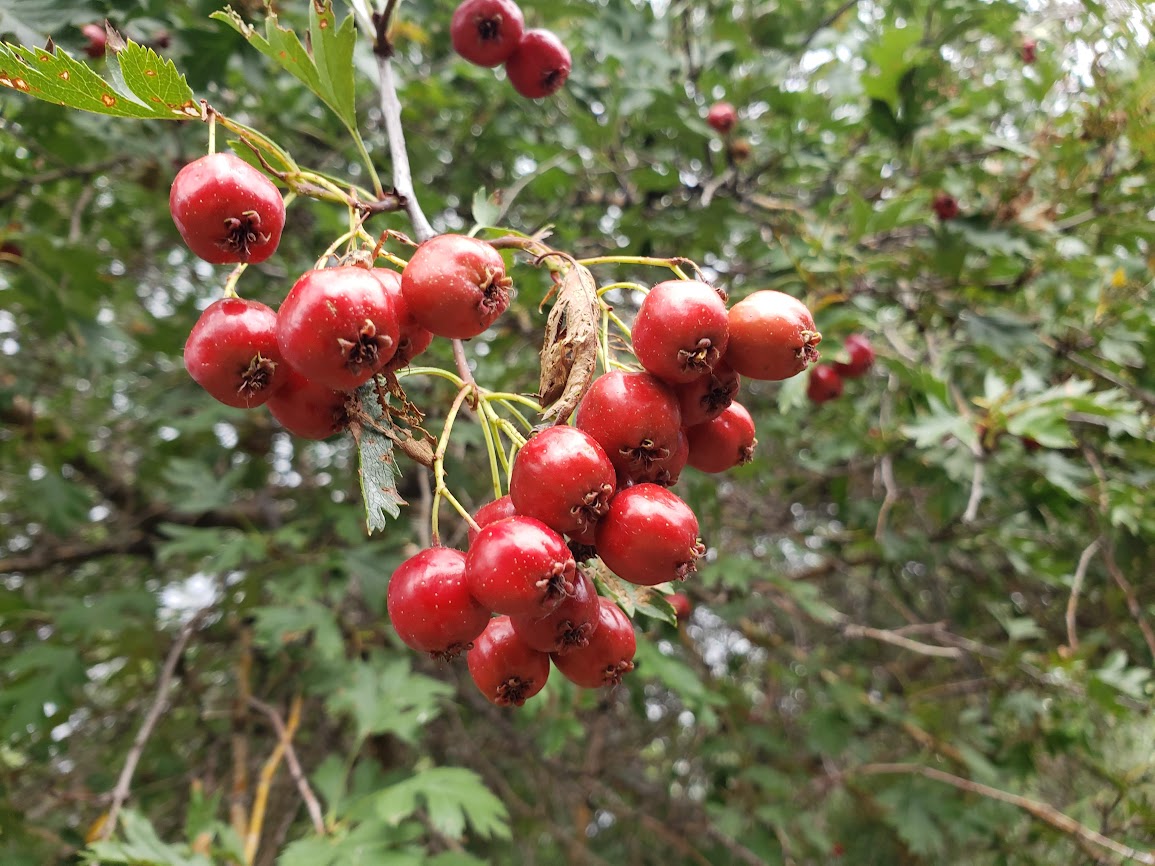 The Russian hawthorn, Crataegus ambigua, has quite a few haws on it, though not as many as in some years. The guy I live with said that some of the purebred border collies who lived here before me liked to graze on them when they fell into the garden.