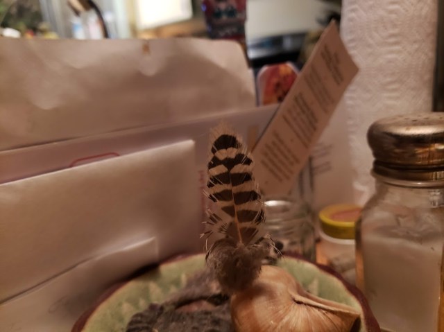 It’s a flicker feather that the guy I live with’s wife found, and has been on the lazy susan on the kitchen table ever since, along with the Roman snail shell you can also see, which was sent to her by a friend living in England.