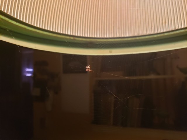 The guy I live with said it can stay, partly because it catches stuff, and partly because one summer, a long time ago, there were fourteen of them in the kitchen here. Yes, fourteen. The guy I live with’s wife liked spiders (he feels a bit differently about them), and they were allowed to stay.