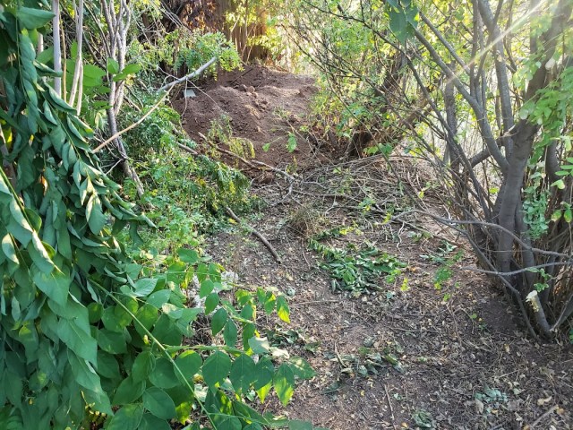 If you remember, the guy I live with cleared out the area on the northwest corner of our yard, where the electrical transformer is, but it turned out that no one needed to go there, for the electrical part anyway, but the telephone repair people did, so that made all that work worthwhile, and, additonally, now there’s a path cleared through the Employees Only section.