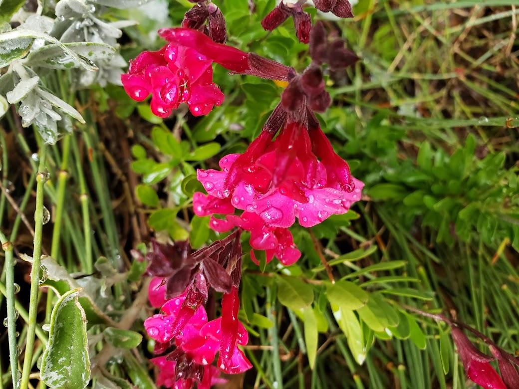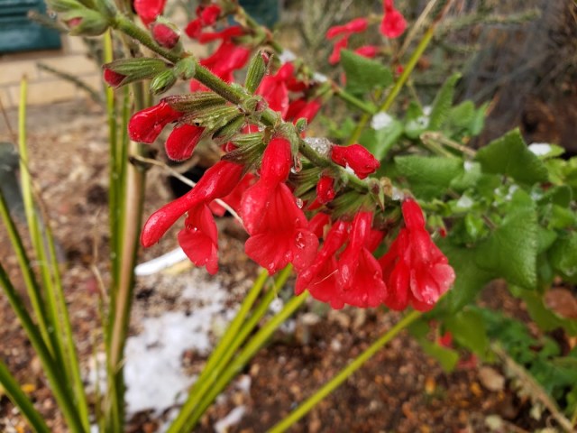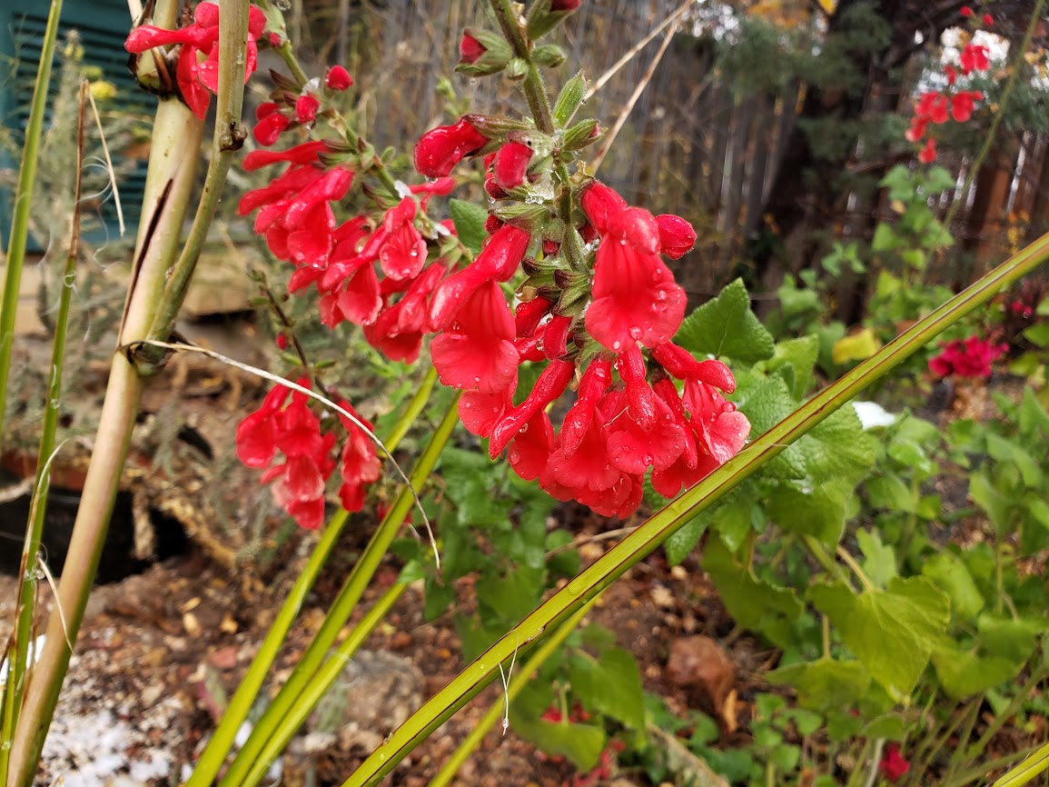 Yeah for moisture. May there be lots more of it. We went from shorts-and-a t-shirt weather to a foot of snow the next day. Lots of tree and shrub damage as things are late to go dormant. I rescued several Salvia guaranitica cultivars and potted them up to overwinter in the garage. They were absolutely huge this year. Do greggii and darcyi overwinter inground for you? Hope the guy you live with is feeling better. Time for lots of napping by the fire.