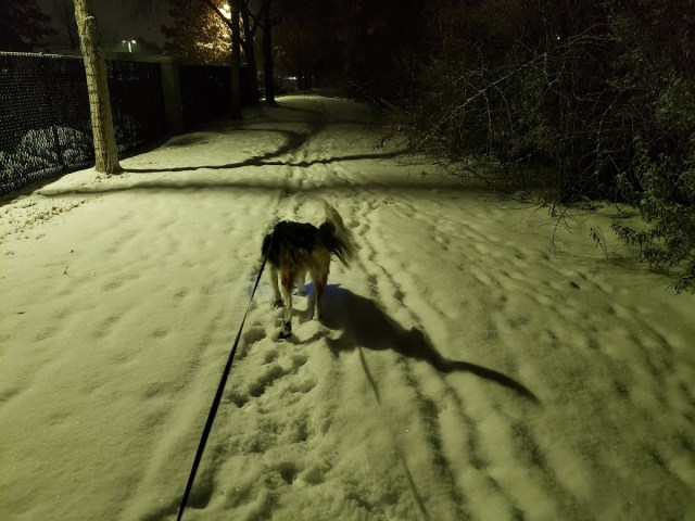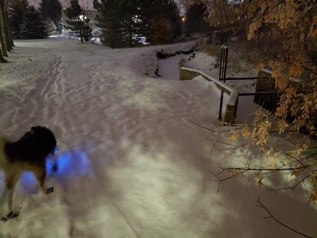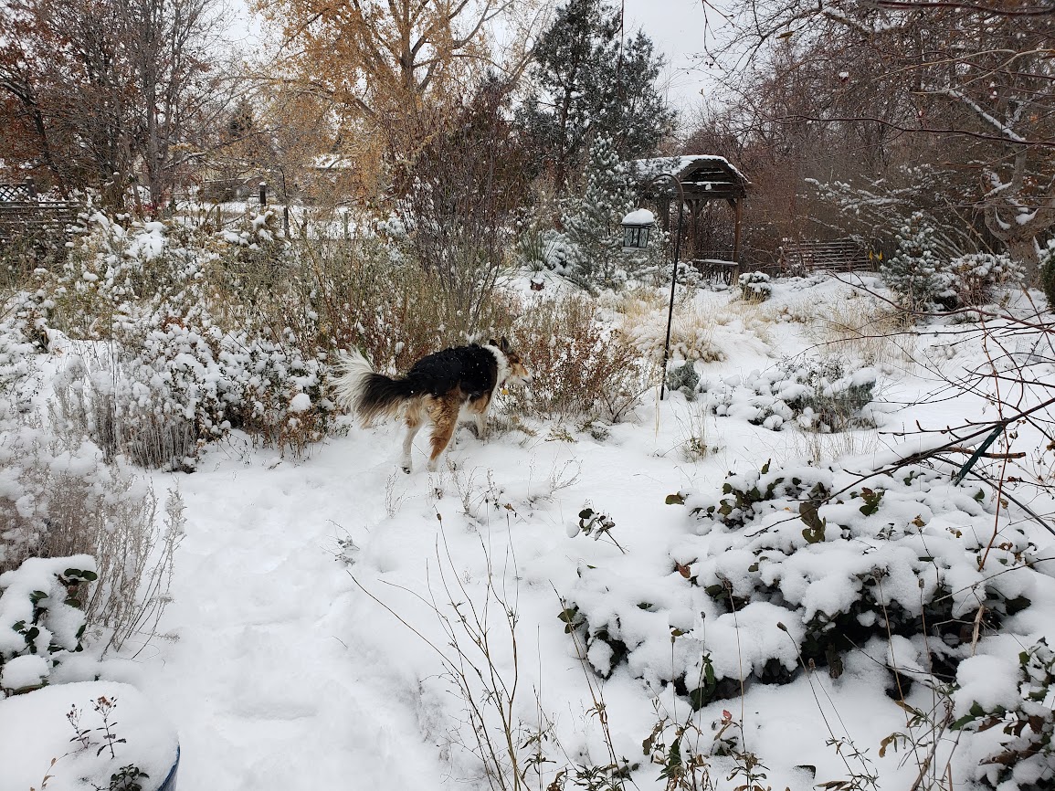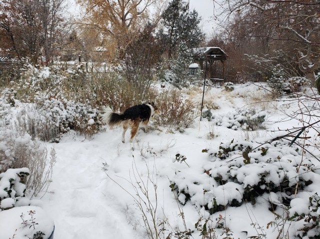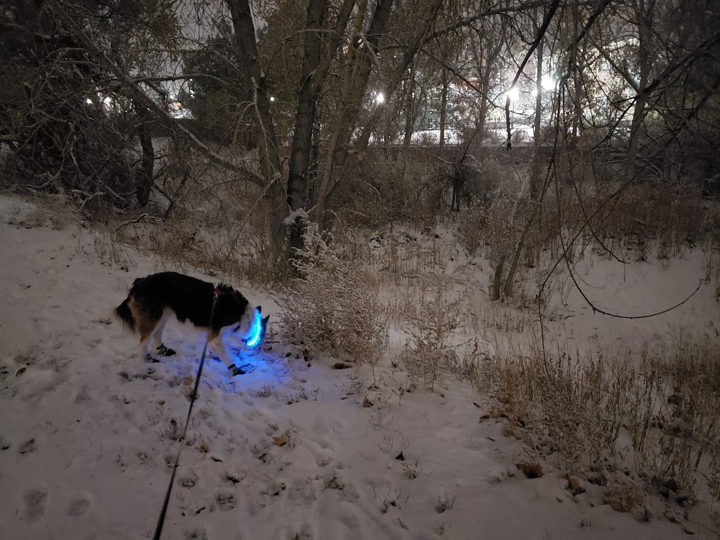 I’m very happy to see you finally got some much needed precipitation. That’s a very nice light-up collar. Very festive for investigating a cold, snowy night. We’ve hit an odd little dry patch of weather, with lots of frost in the mornings. Time to go out and do a little rain dance and plant some of the seeds I’ve forgotten about that need stratification.