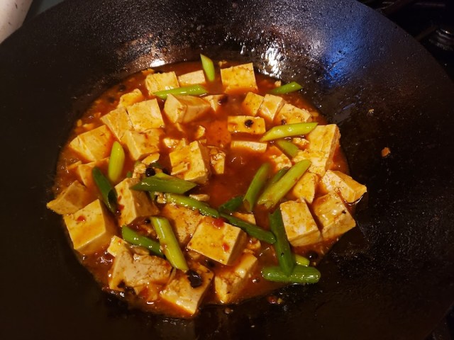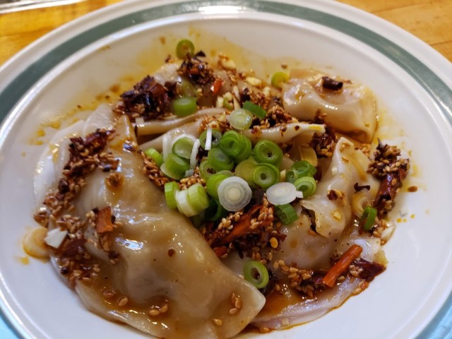These are Sichuan-style dumplings with chili oil and other things. (True, they’re really supposed to be won tons, but the guy I live with hasn’t made any won tons, yet.)