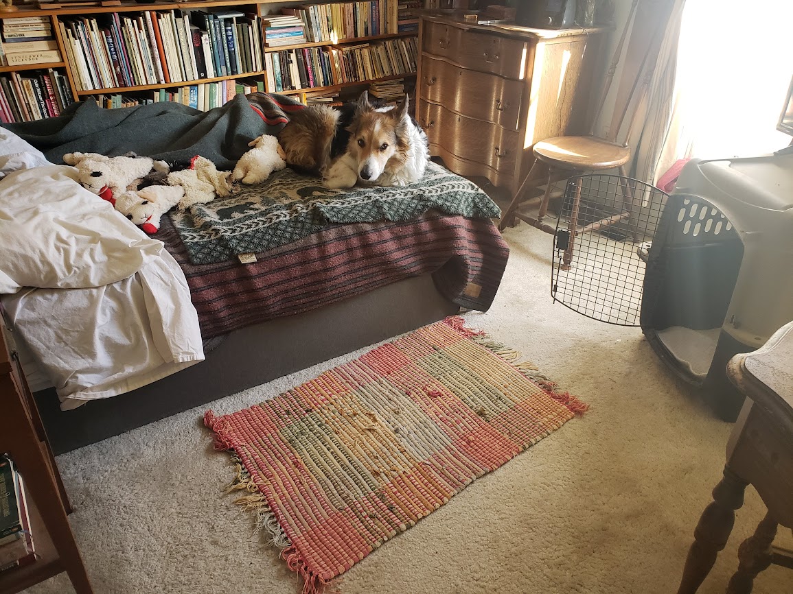 You can see I have a lot of Lamb Chops with me on the bed. I share this bedroom with the guy I live with, though sometimes I spend time in my Upstairs Fort, which you can see there, and sometimes I sleep in the chair in the living room. The guy I live with said that some of the other purebred border collies who lived here slept in that same chair. The chair is as old as the couch; about ninety years old.