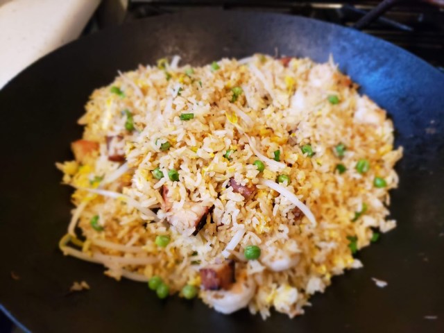 And, finally, fried rice. This was a different recipe from his regular one, and the guy I live with almost gagged at the suggestion of adding a whole tablespoon of salt. He didn’t add any salt.