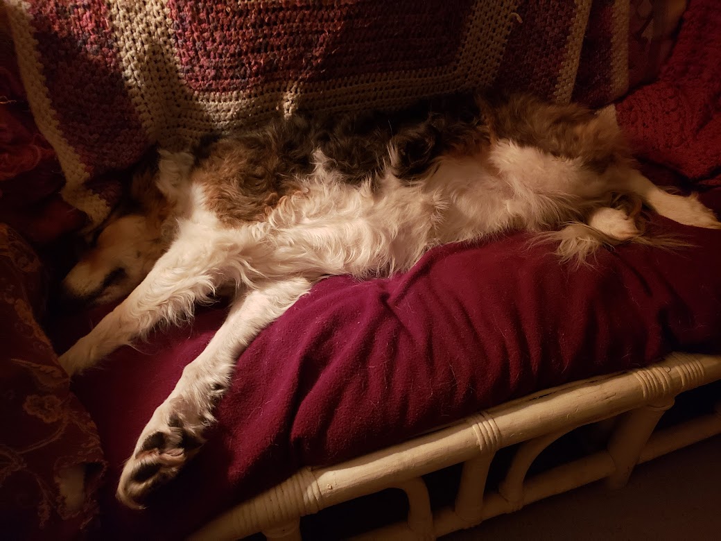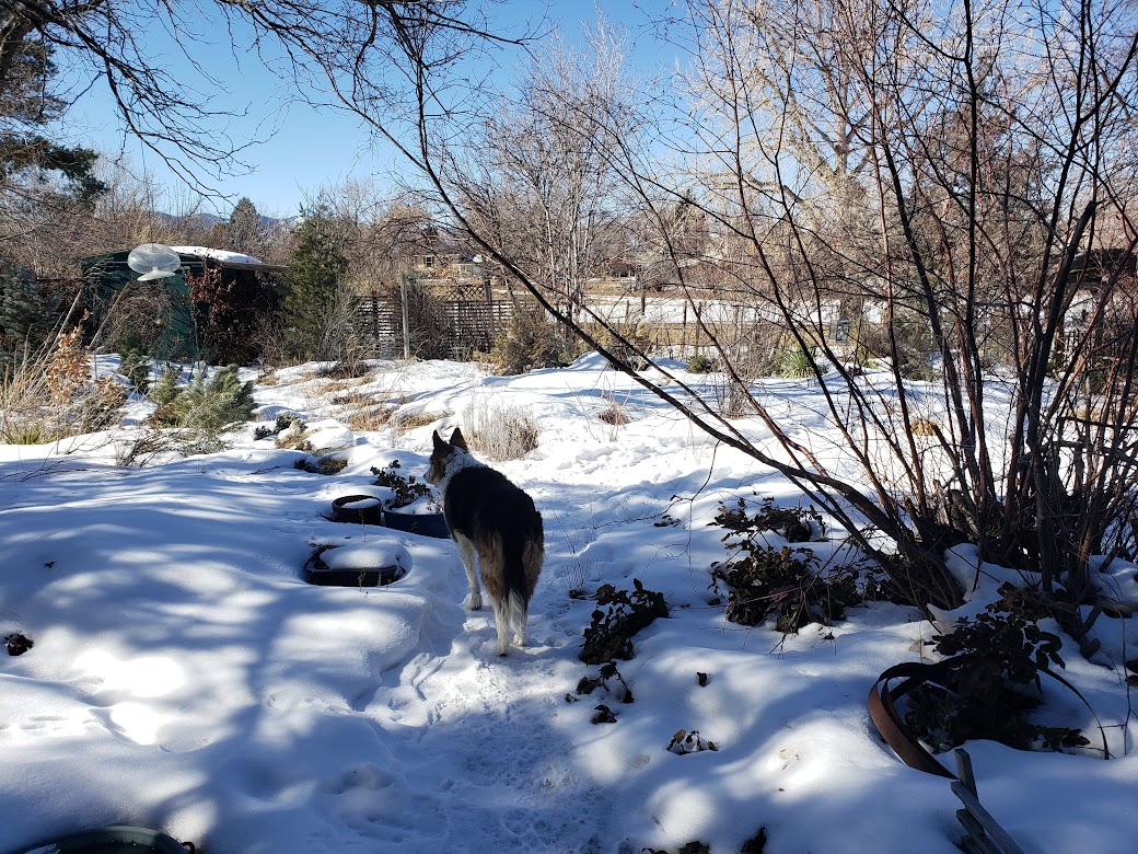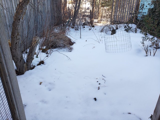 The guy I live with has a lot of experience just standing in subzero weather, like say waiting on hold when he worked for the phone company, so this comes in handy when I get distracted at Tinkle Time. But it is my job to chase rabbits out of the garden. (We’re not sure how they get in.) He does get impatient, though, because it’s cold and he wants to go to bed.