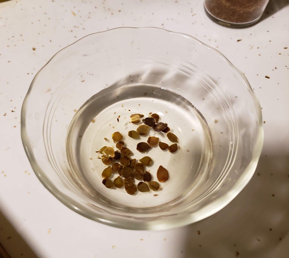 The seeds are placed in a dish with hot water overnight, and then put in a damp coffee filter or paper towel, and placed in a plastic bag, in one of the propagators in the upstairs bedroom (with bottom heat); the seeds germinate in a day or so and are potted in peat pots when the seeds have formed roots.