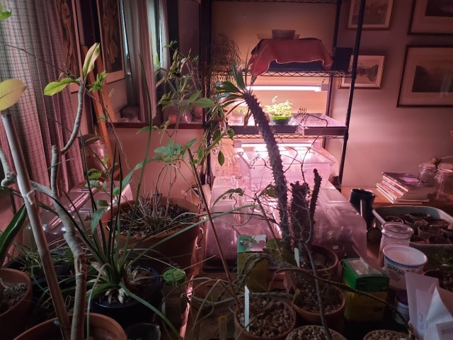 Those are Feit LED grow lights. The shop lights kept failing, flickering, making loud buzzing noises, and so forth, so the guy I live with tried these. They seem to work. Most of the seedlings are going to be given away. The greenery on the baker’s rack is the holy basil, which the guy I live with is going to eat. The propagator with a towel over it has some buffalo gourd seeds which he hopes will germinate in the dark.