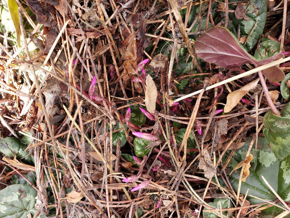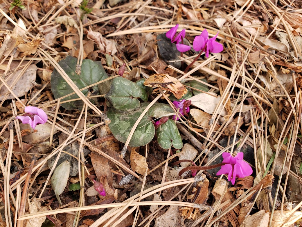 Mostly what happened today was raking pine needle mulch off the bulbs, especially the cyclamen. This one should have had the mulch removed earlier.
