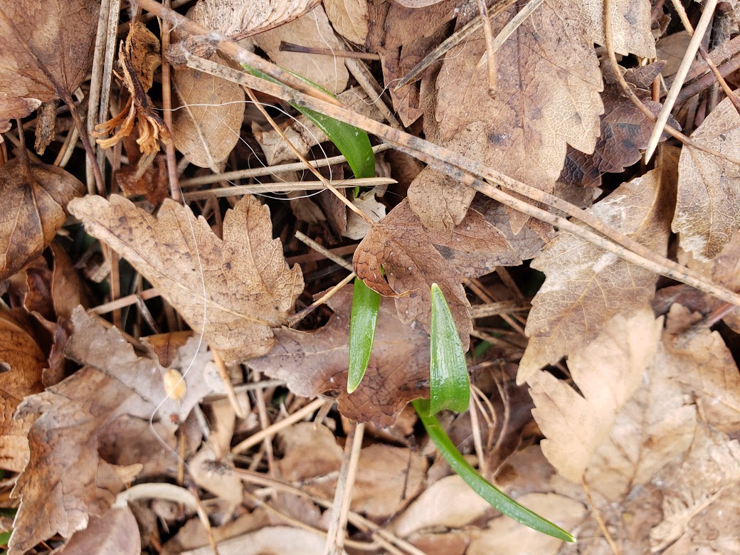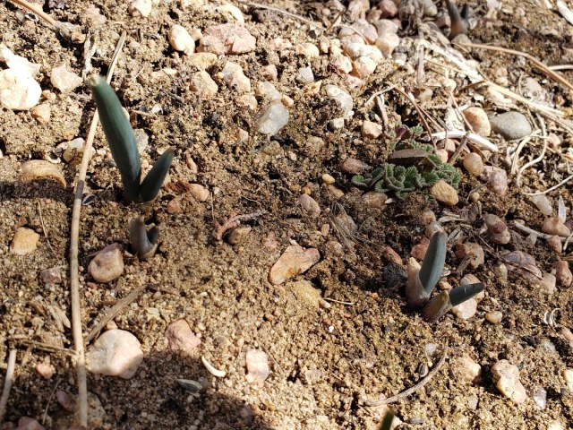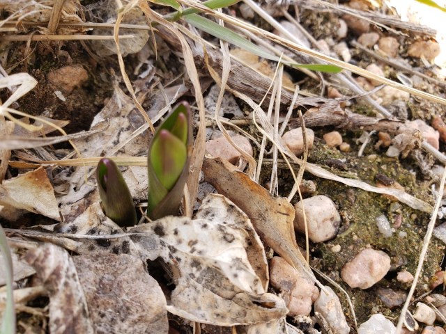 Even though this has been a long, rough winter, and we’re still supposed to get more cold weather later this week, the guy I live with was very pleased to see these leaves. There’s another corm pushing up leaves a little distance away.