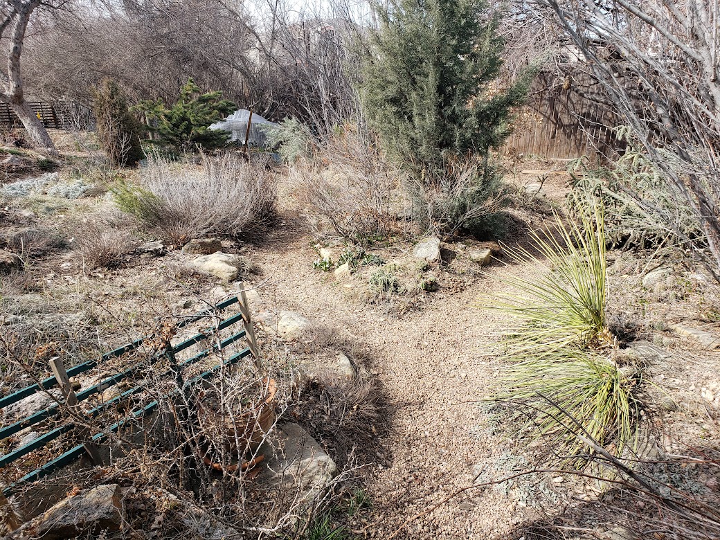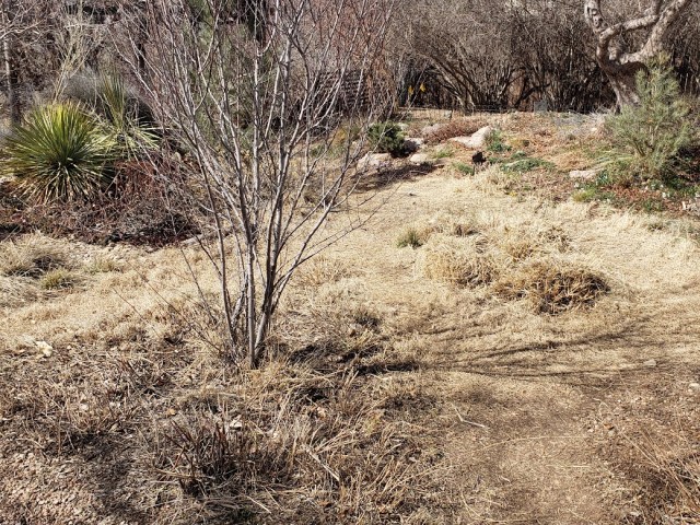 Regular bluegrass lawns are still brown, too, with just a little green showing, so that’s kind of a double standard. But when there was bluegrass here, the green was really jarring in combination with the raised beds. (He asked people who knew about such things and they said Yes, it was.)