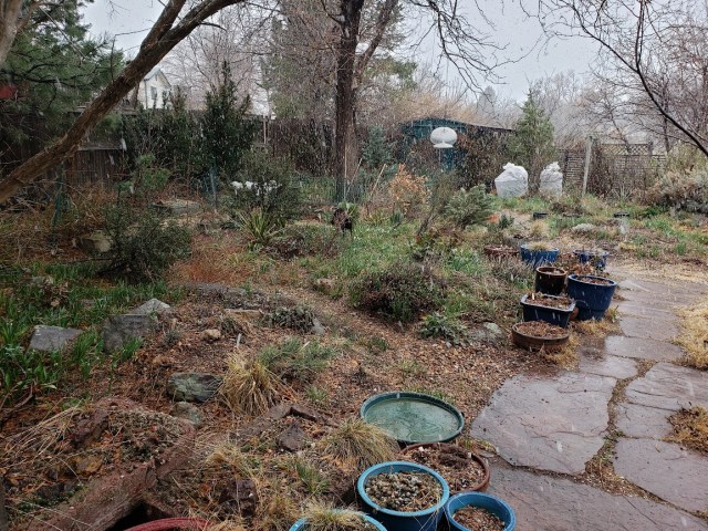 This is it snowing. I’m not in this picture. The plastic things are “personal greenhouses” for bulbs.
