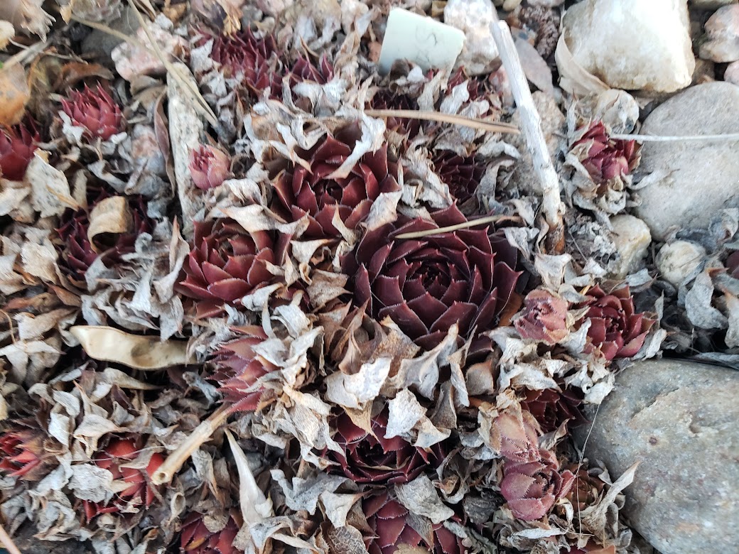 Yes, sempervivums;those are what are in the pots you see in almost every picture of me surveying stuff. There must be a hundred different kinds here.