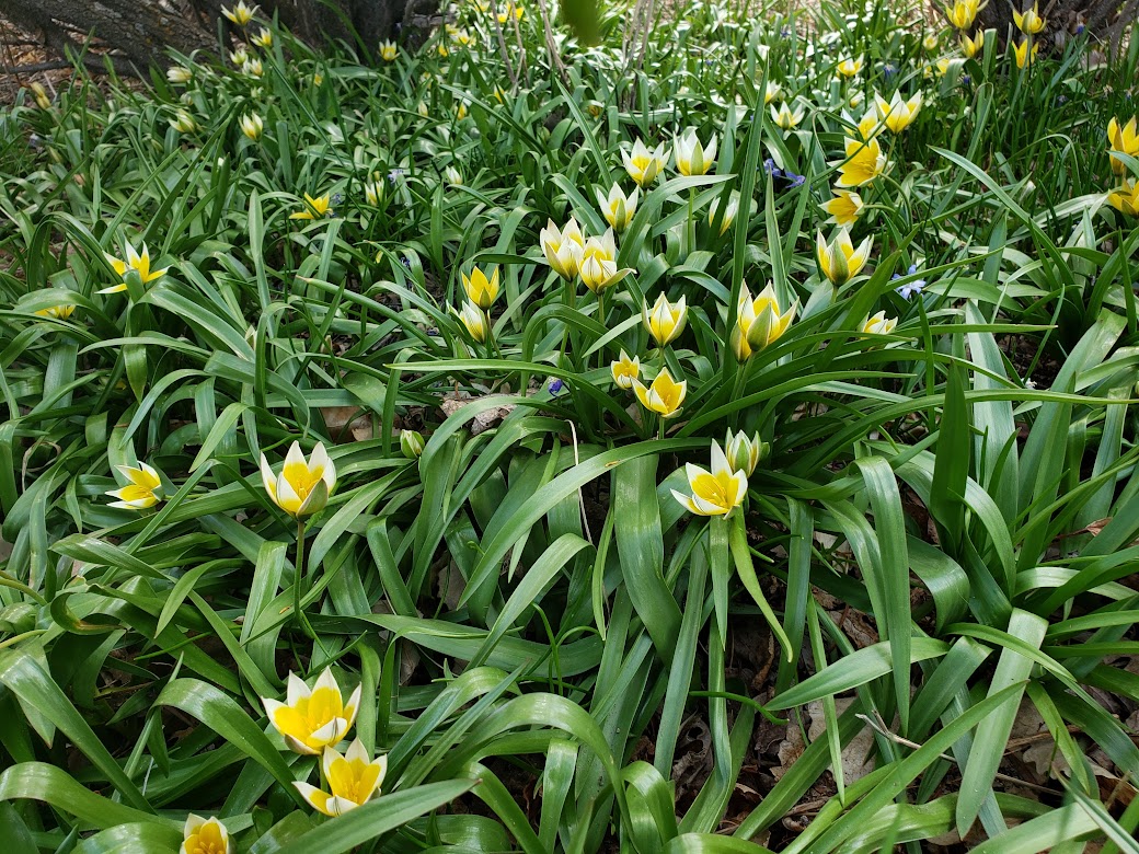 In the front yard, Tulipa tarda is flowering. It seeds all over.