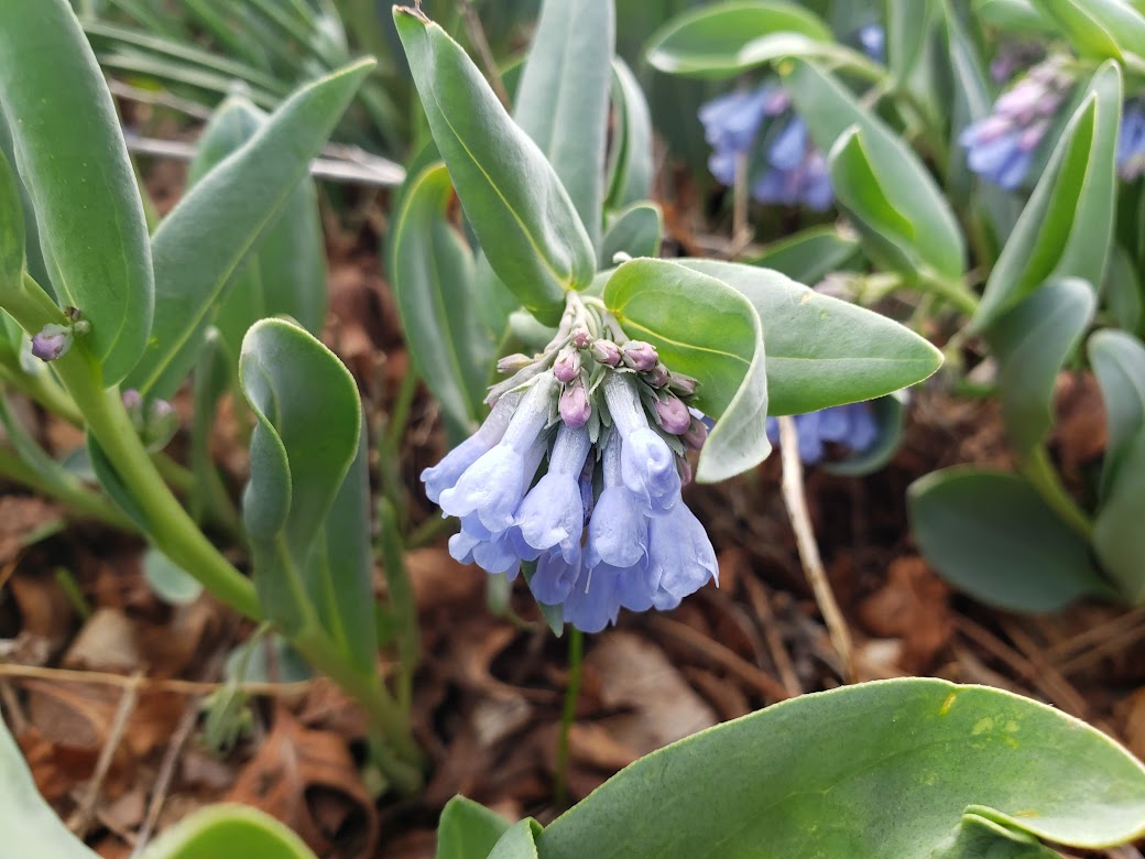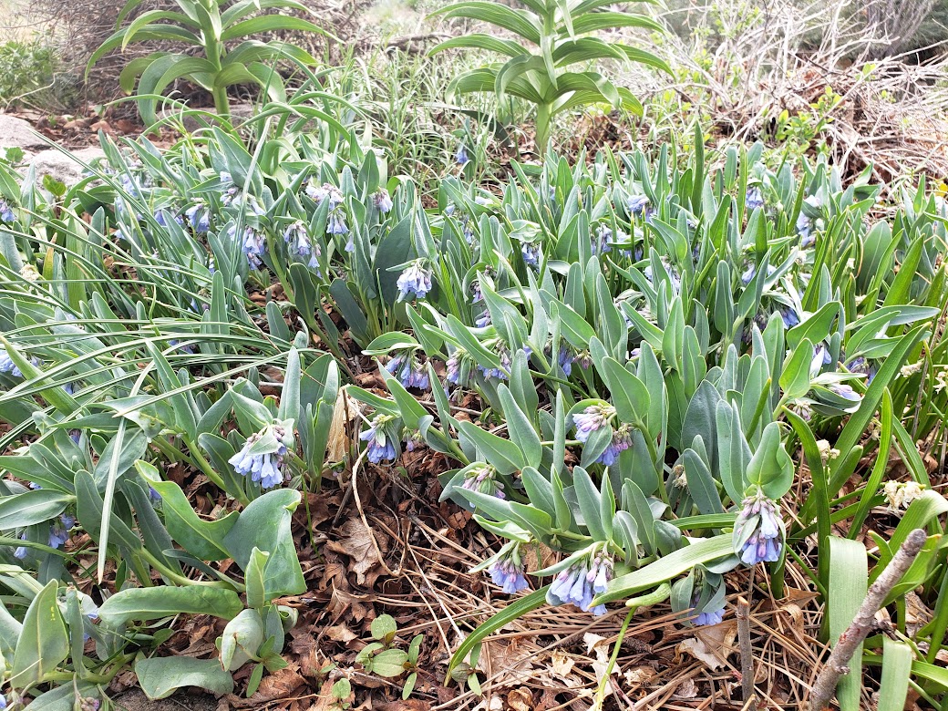 The native bluebells, Mertensia lanceolata, are flowering, too. There are plants growing in the wild not too far away from here, in Red Rocks Park. This is a dryland mertensia, though I think it also grows at higher elevations, too.