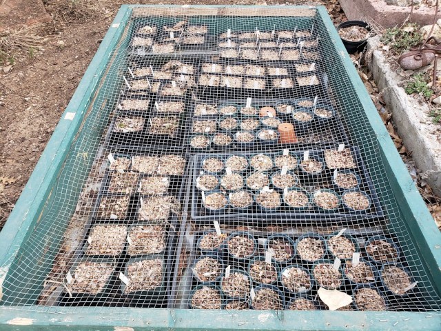 There are a bunch of penstemons germinating in the pots on the far end, but the guy I live with suspects that most of the seeds in the pots closest to the near end, which have been there for a few years, will never germinate. He says that’s the way things are, and he’s okay with that.