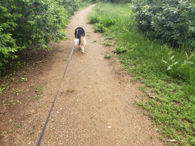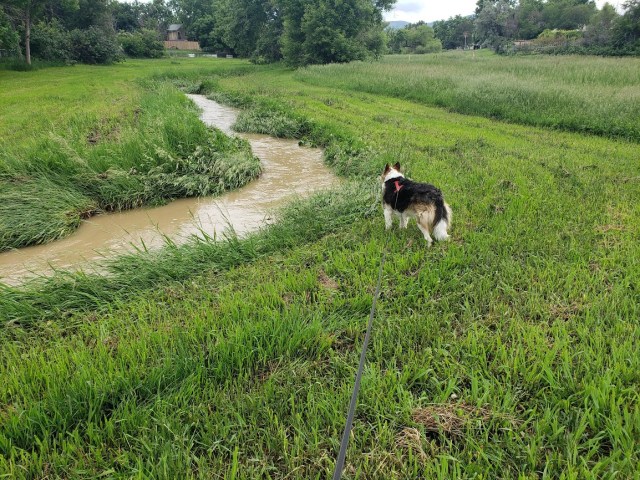 I kind of wanted to walk along the creek, but the guy I live with said maybe that wasn’t a good idea, because of ticks, even though I have a fancy flea and tick collar which seems to work. It kind of reeks, though, He got it from Only Natural Pet, though he doesn’t think of me as a pet, but rather as a companion with equal standing in our house, and in our lives.