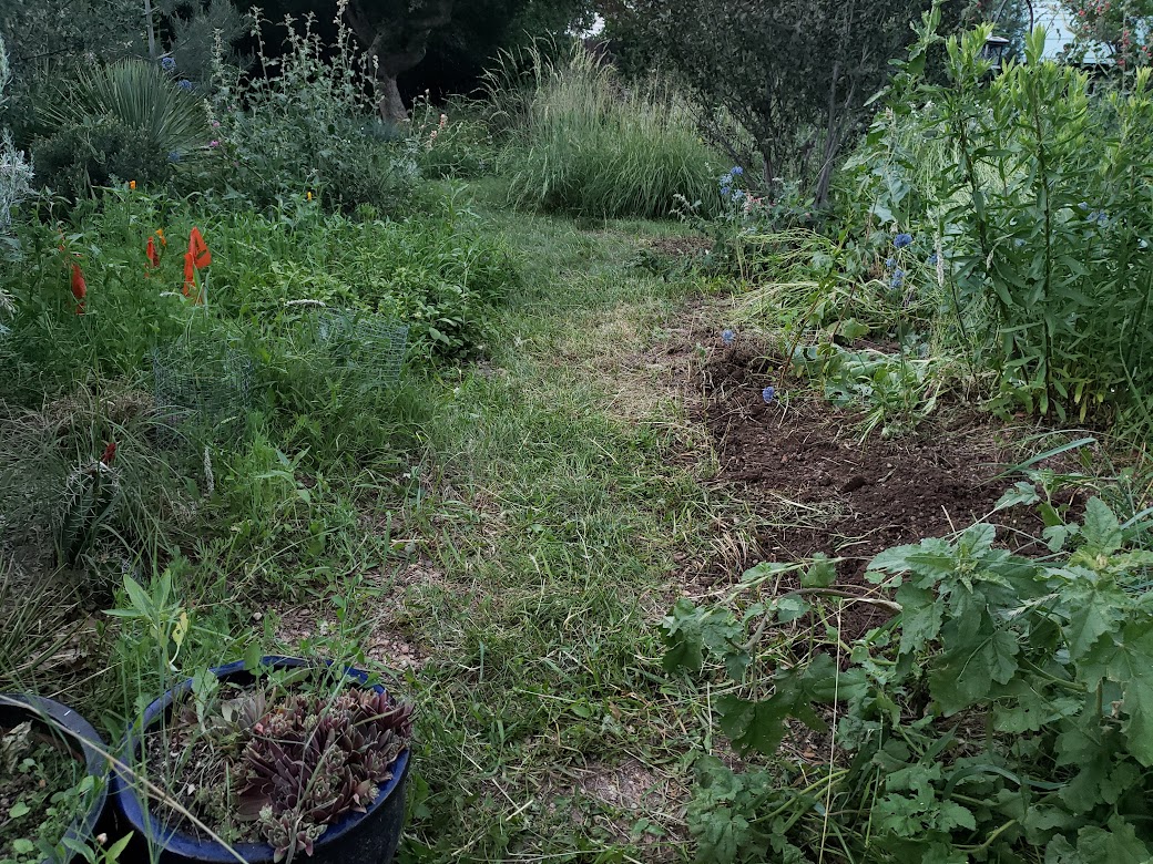 Anyway, what he did yesterday and today was clear out the path between the raised bed in the center of the yard, and what used to be called The Long Border on the left.