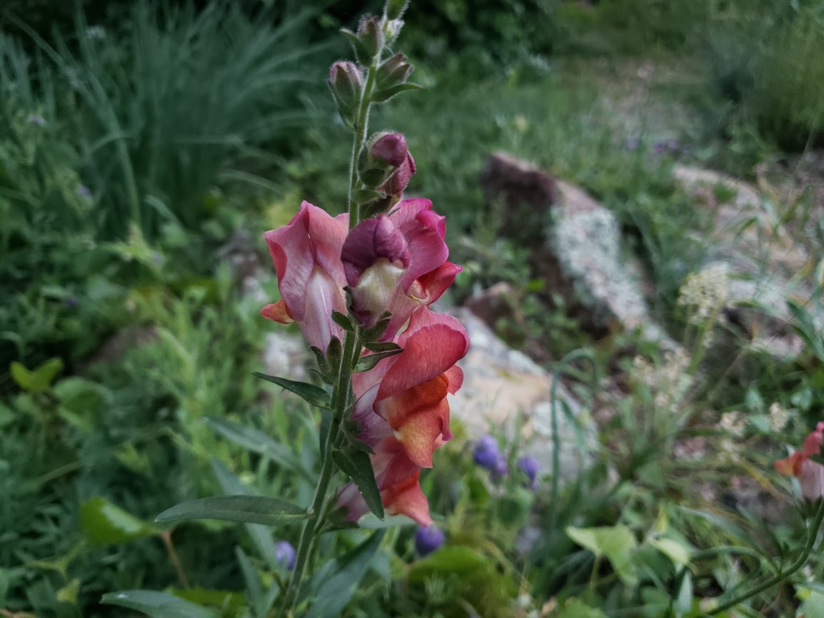There are some plants flowering; the guy I live with said he might rethink his idea of not having much in flower at this time of year, because the hail we had hardly did any damage at all. The rain flattened a lot of the grasses and other plants, and the path along the north side of the garden is impassable in places.