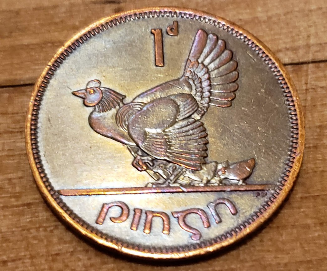 Lovely to see the old penny, a coin of my childhood – cearc ‘s ál sicín – a hen and brood!