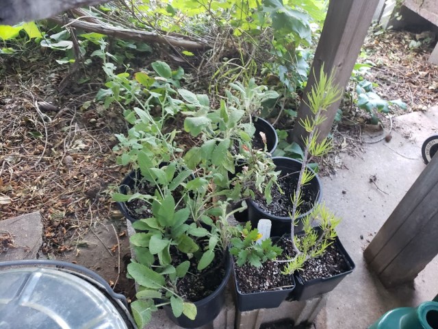 There are other plants on the patio, being treated to the “super genius” method so that they’re well-rooted before being planted out.