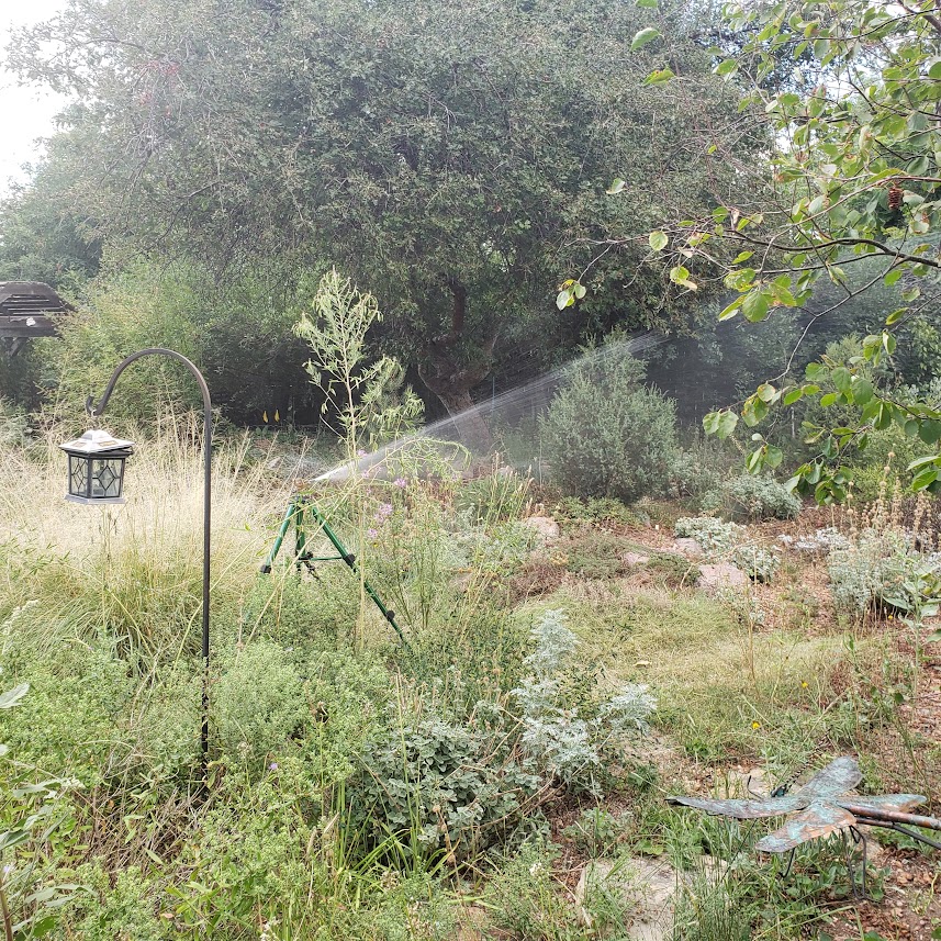 Hmm, that sprinkler seems to be set at the right height to encourage a feeding squirrel to move elsewhere. We finally had an inch of rain on Thursday after 4 months without any precipitation at all. Too late for most of what I planted this year, which has all been blasted to a crisp. Time to rethink my planting strategy and either only plant in the Fall or late Winter.