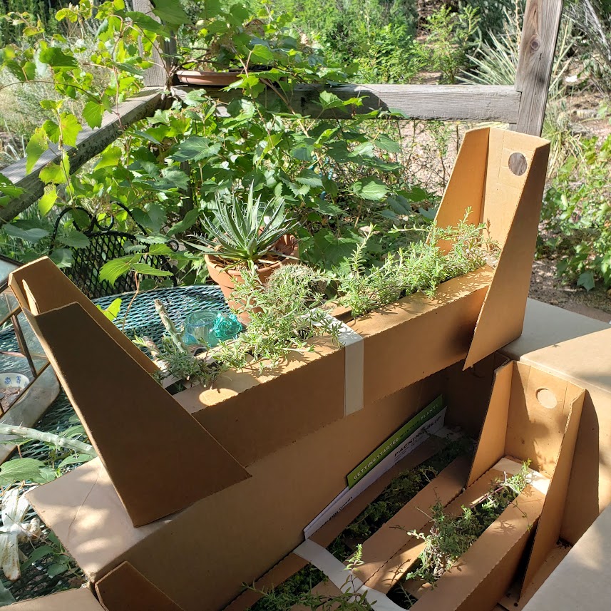 It’s really hot today, with fourteen percent humidity, so the plants had to be treated to the “super genius” method right away. They were repotted into larger pots and watered.
