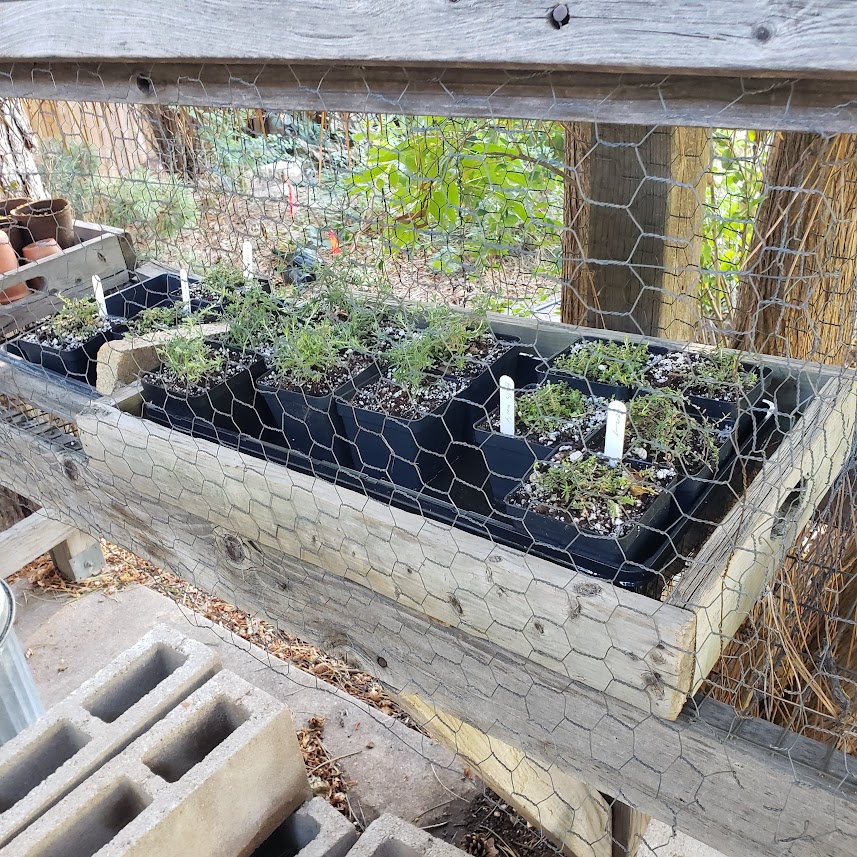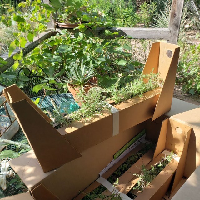 There are fifteen potted thymes on the shelf, and they’re ones that don’t need a whole lot of water. Sometimes, some thymes do (sorry), but these don’t.