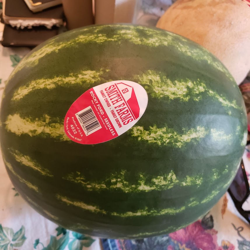 This is a cantaloupe from Rocky Ford, which is two hundred miles away from here, to the south. The guy I live with isn’t a melon chauvinist or anything, but Rocky Ford cantaloupes are the best. I’ve had cantaloupe. Purebred border collies love cantaloupe.