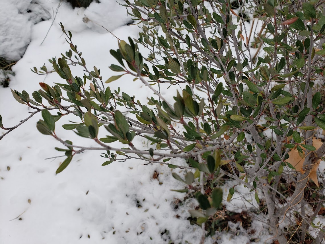 This one didn’t photograph well even today, but it’s an evergreen version of the usually deciduous Cercocarpus montanus, a common shrub in the foothills here.
