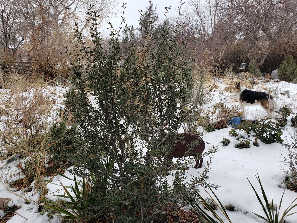 This is another Cercocarpus ledifolius which was given to him by a friend. It’s been plunged, as they say in the U.K., into the soil for the winter.