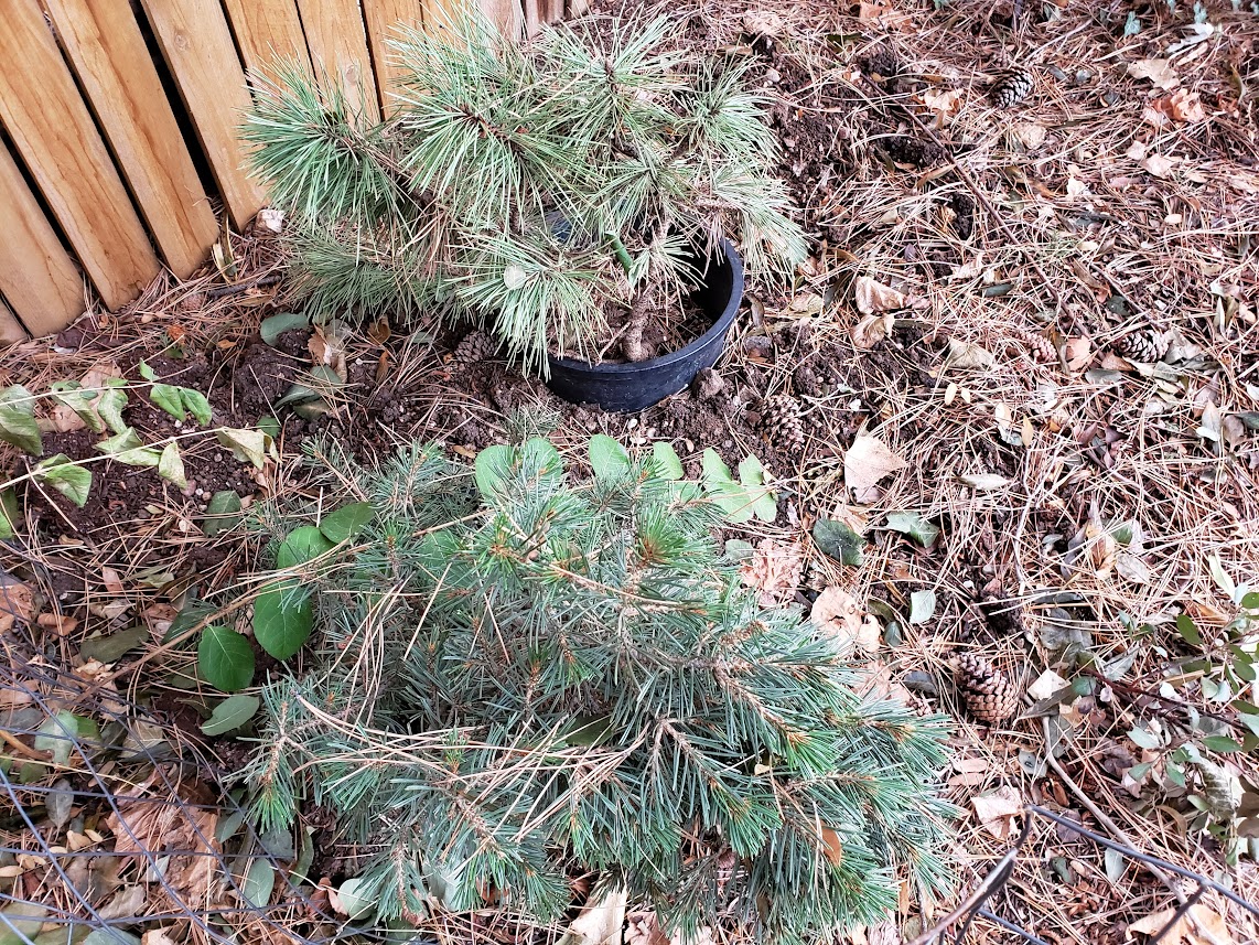 The guy I live with says this is a lot safer method of transplanting evergreen plants, instead of just digging them up and planting them somewhere else. The plants get almost a whole year of being watered and pampered, in partial shade, and then next year they’ll be hardened off to the sun maybe in May.