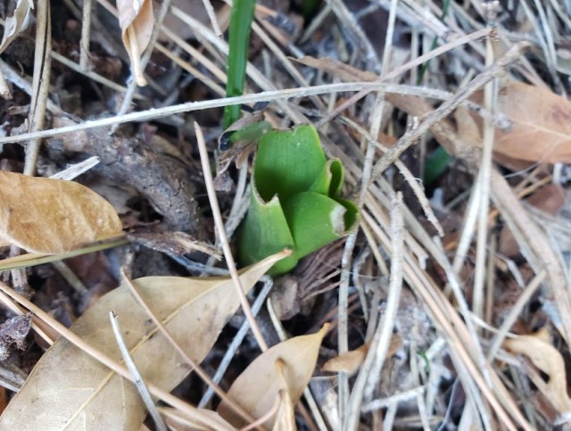 This is new growth on Colchicum kotschyi, from Iran. The guy I live with said this was “completely wrong”, and if it gets as cold as they say it will next week, these leaves will be covered with pine needles, just in case.