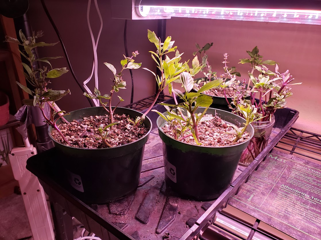 The rooted basil is doing well, under lights. The lights make the color look weird.