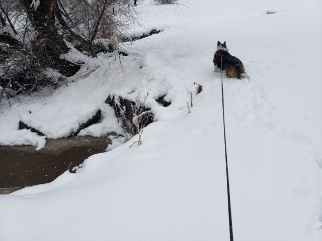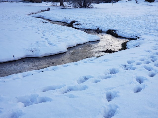 Yesterday there was a lot of water in the creek. It’s not very cold outside and so the snow is mostly slush.